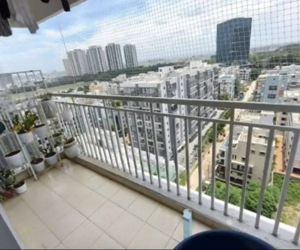 Furthermore, the flat includes Three contemporary Bathrooms. This desirable 3BHK-3Bath configuration minimizes morning rush hours and provides maximum convenience for a family. All bathrooms are fitted with branded sanitary ware and premium CP fittings. In contrast to some larger units, this apartment includes One spacious Balcony (as confirmed by the images, which show a usable, net-covered balcony space with potted plants and stunning high-rise views), offering a private outdoor retreat to enjoy the sprawling cityscape and community vistas.