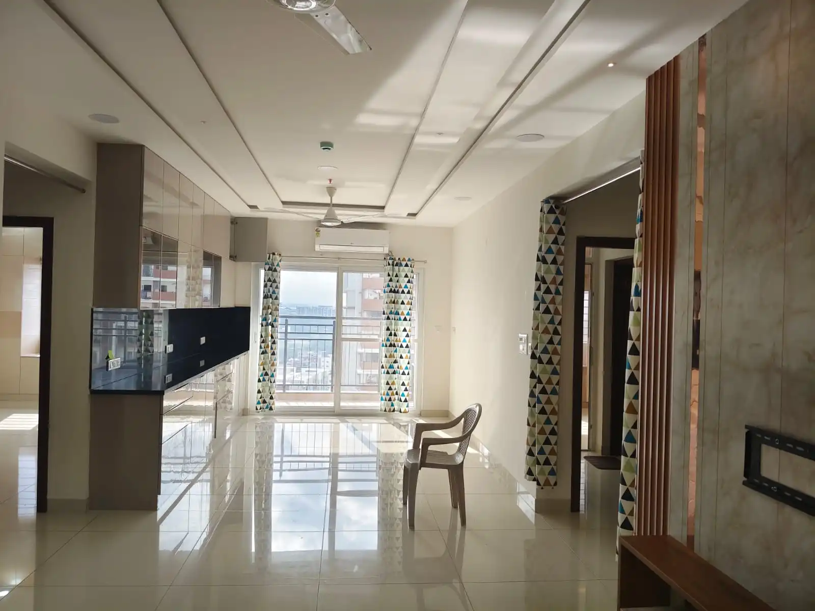 Adjacent to the living area is a state-of-the-art modular kitchen. In fact, it’s a chef’s dream come true. The kitchen is fitted with sleek, high-gloss cabinets that provide abundant storage for all your cookware, groceries, and appliances. The dark, polished granite countertop offers plenty of workspace for meal preparation. Moreover, the open-plan design ensures that you can interact with your family or guests in the living area while you cook. It is designed for efficiency and style, making daily cooking a pleasure. This feature truly sets it apart from many other flats for rent in Hyderabad