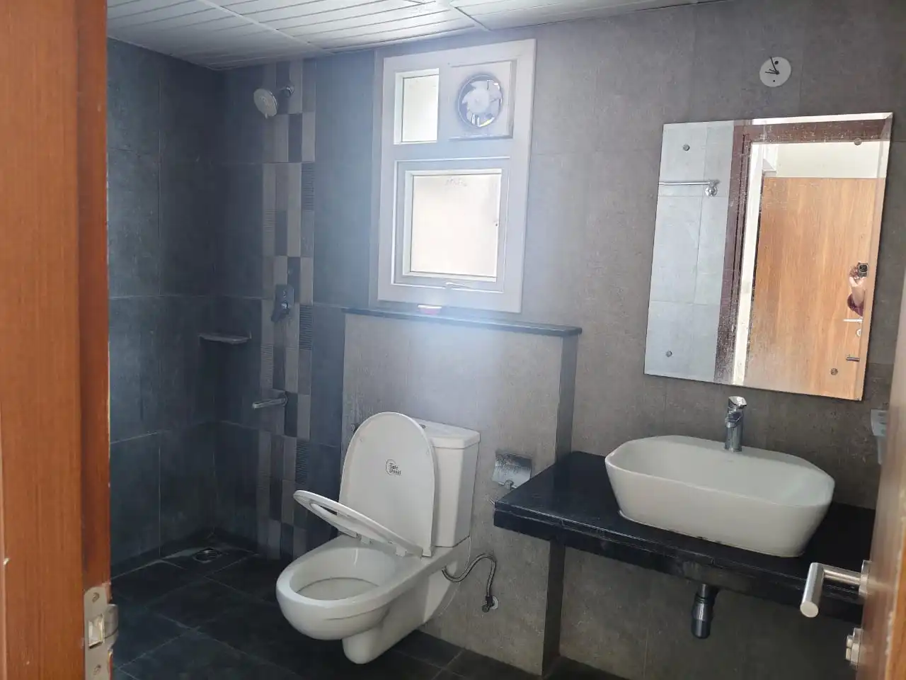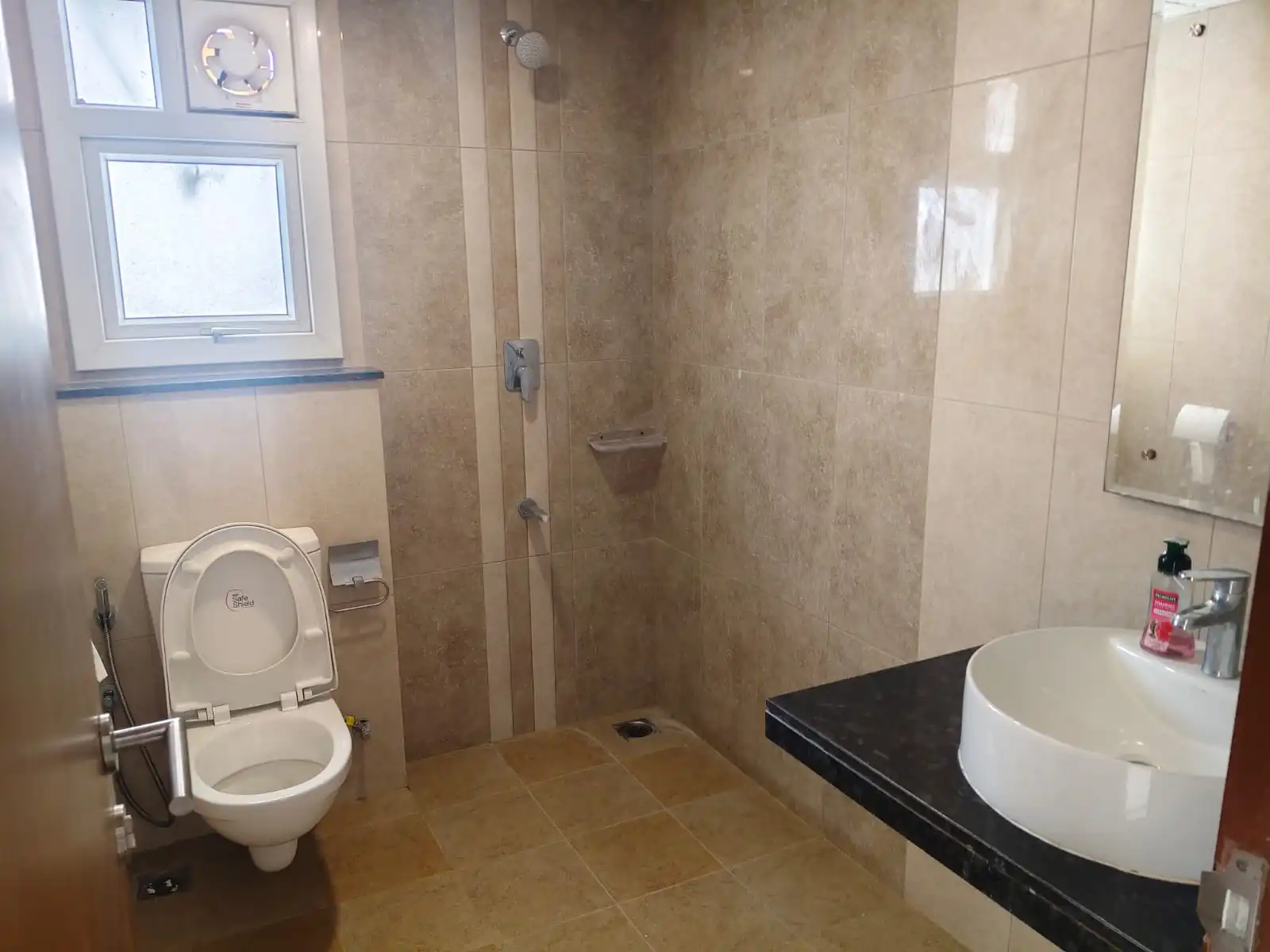 The apartment includes three well-appointed bathrooms. Each bathroom is designed with stylish, modern tiles—one featuring a chic grey theme and another with warm beige tones. They are all fitted with premium sanitary ware, contemporary basin designs, and high-quality shower fixtures. Crucially, geysers are installed in all bathrooms, ensuring you have access to hot water 24/7. The provision of windows and exhaust fans guarantees that the spaces remain fresh and well-ventilated.