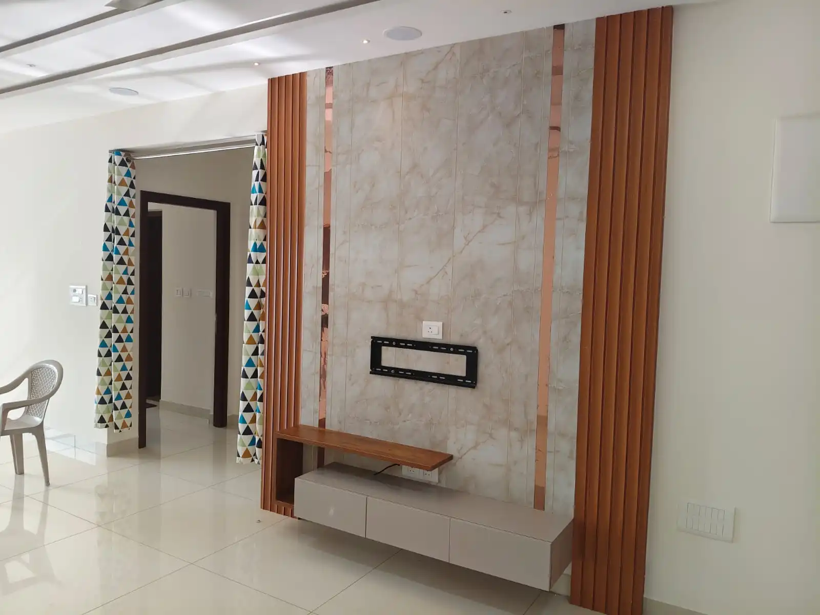 As you enter, you are greeted by a large, sunlit hall that serves as the heart of the home. This versatile space is perfect for both relaxing with your family and entertaining guests. The first thing you’ll notice is the stunning, custom-built TV unit, which is a masterpiece in itself. Featuring a marble-finish back panel with elegant rose-gold metallic inlays and rich wooden accents, it is designed to be a beautiful focal point. Additionally, large sliding glass doors open onto a balcony, flooding the room with natural light and offering breathtaking panoramic views of the city skyline. The layout provides ample room for a comfortable sofa set, a coffee table, and a separate dining area, making it a truly functional and inviting space.